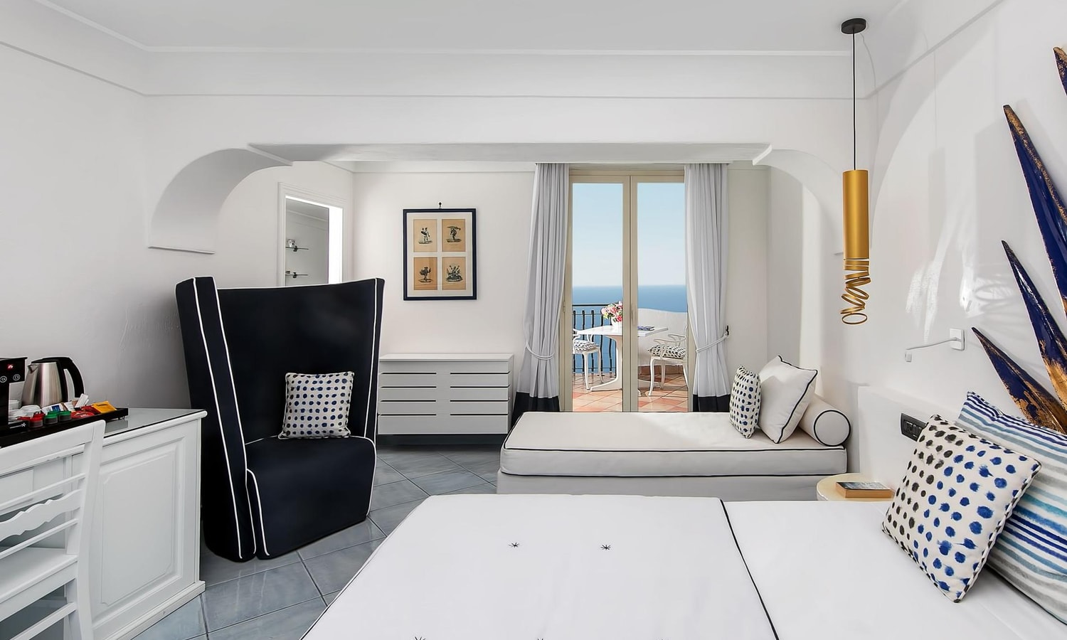 The Deluxe Rooms provide 38 m² of comfort and a design inspired by Positano’s colors - blue, light blue, and emerald green, recalling the sea and coastline. Spacious, filled with light, and carefully detailed, they’re ideal for guests seeking both relaxation and style in one of Italy’s most iconic locations. The large private terrace is perfect for sunbathing, reading, or savoring a drink with a stunning view.