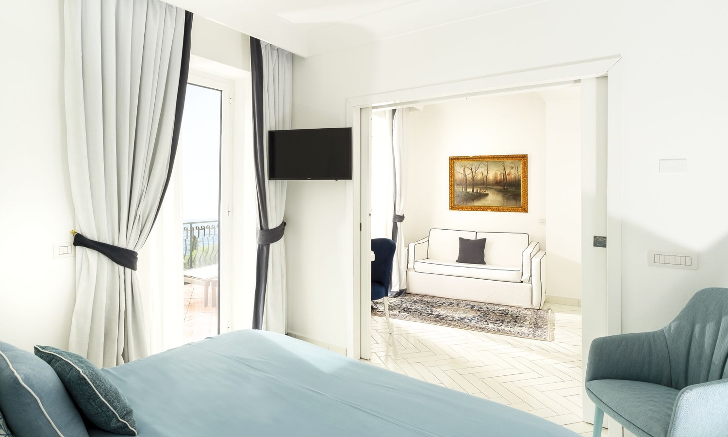 Our rooms seamlessly blend understated luxury with distinctive design. The connection to the Coast is echoed in our choice of materials, including warm wood, exquisite marble, and the iconic majolica tiles of Vietri. Our color palette, with hues of blue and azure, further celebrates this coastal influence. Each room features a spacious balcony overlooking the bay of Positano, offering breathtaking views of the Mediterranean, day or night.